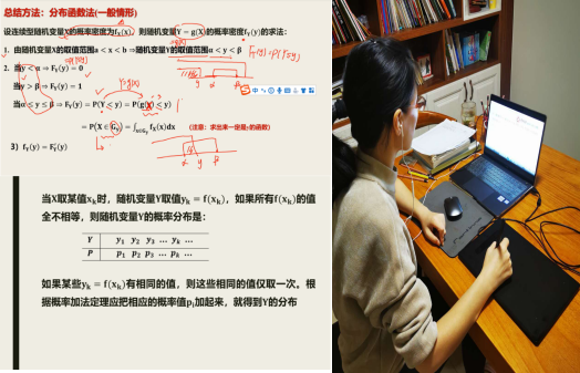 考虑到很多平台出现网络高峰期拥堵现象,经过和班级学生的反复测试最终采用了录屏教学的方式。应用“屏幕录像专家”提前将讲课内容录制成MP4视频文件,提前发送给学生并且在每次上课前十分钟通过QQ群提醒学生按时听课。在线上开展教学,张老师认为最大的困难在于:1.大部分学生没有纸质教材,所以线上讲课一定要放慢速度,讲得细致一些,以便于学生有充足的时间做笔记,让他们慢慢消化,否则讲得太快学生来不及消化,导致前面没搞懂后面学起来会非常困难。2.线上教学,老师见不到学生,没办法直接看到学生的学习状态以及学生对所学知识点的直接反馈。因此,要求学生每节课必须做笔记并且要求学生将课上所讲例题一定要先听懂然后按暂停键自己再做一遍,最后将课堂笔记当天发到微信作业小程序上。通过课堂笔记的上交情况和笔记的质量可以较全面了解学生的出勤率以及听课的状态和对课上内容的掌握情况。同时,每节课下课,老师会通过QQ群和微信群随机抽取部分同学了解他们本节课的学习情况,将学生容易出错、难理解的地方记录、整理,习题课统一讲解。3.《概率统计》这门课程涉及到大量的计算,比如现在讲到一维连续型随机变量及其分布,每节课都需要用微积分进行计算,最好的讲授方式就是板书,边板书边讲解,能够提高学生的注意力,加深理解,规范学生的做题步骤,因此张艳伟老师专门准备了汉王手写板,真正地做到了边讲边写,并且随时可以对重点、难点进行标注。