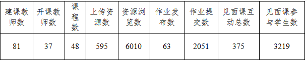 一周来,我校在线教学授课情况为:开课课程总数1081门,总课程门次3000,教学周合计2198个,授课教师808人,共3000人次,学生在线学习数共计159299人次,学生平均到课率99.19%。
