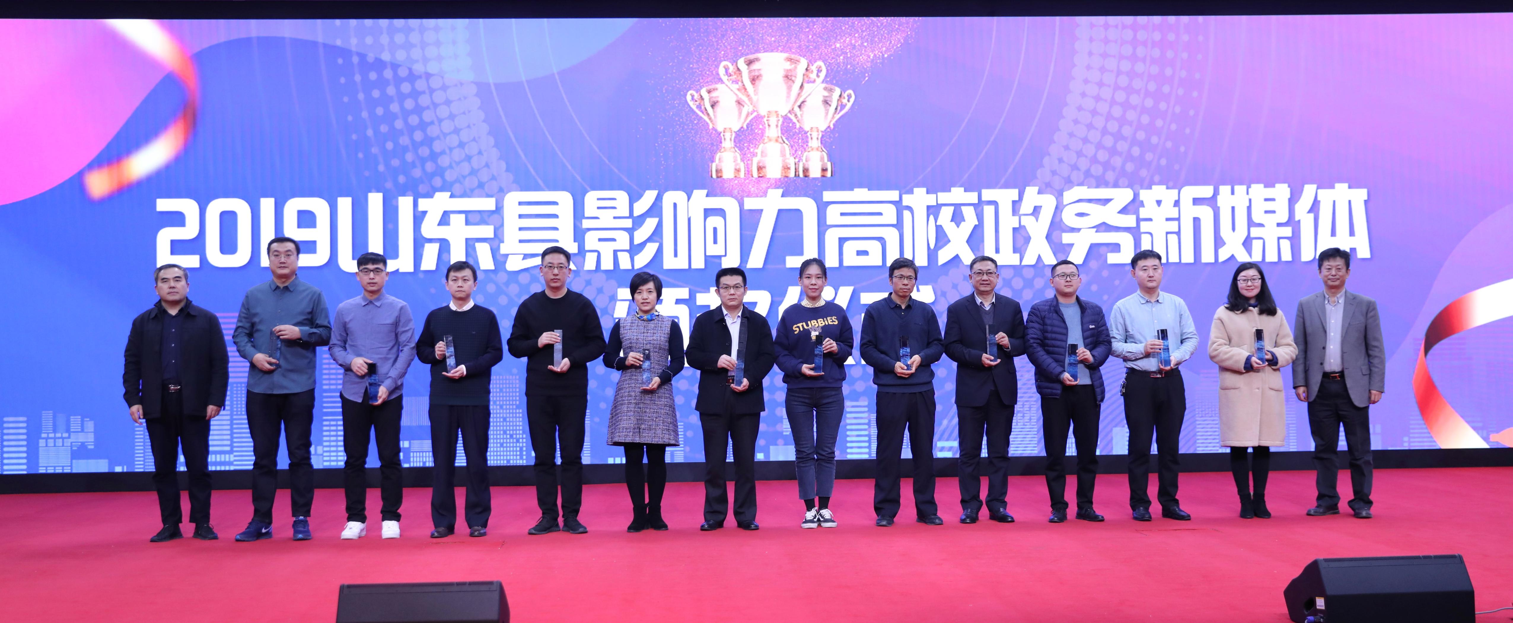 12月20日,由山东省互联网传媒集团主办的山东高校品牌建设与传播管理研讨会暨2019山东最佳社会声誉高校颁奖仪式在临沂大学举行,我校荣获“2019年度山东最具影响力高校政务新媒体”称号。山东省教育厅(省委教育工委)办公室调研员、新闻中心主任宋全政,省网媒集团党委常委、副总经理姜长勇为获奖单位颁奖。全省108所院校的代表参加颁奖活动。