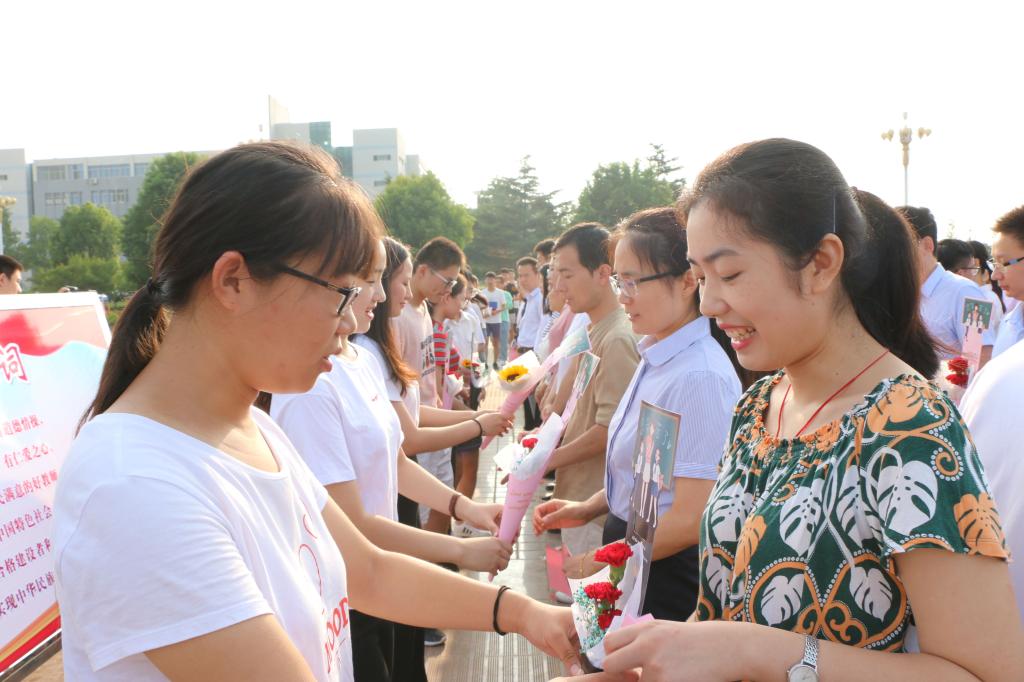 学生代表崔煦箐在国旗下满含深情的演讲,表达了对全校教师的诚挚感激和真诚祝福。伴随着音乐《感恩老师》,学生代表们纷纷将鲜花献给老师,送上对老师的节日祝福。