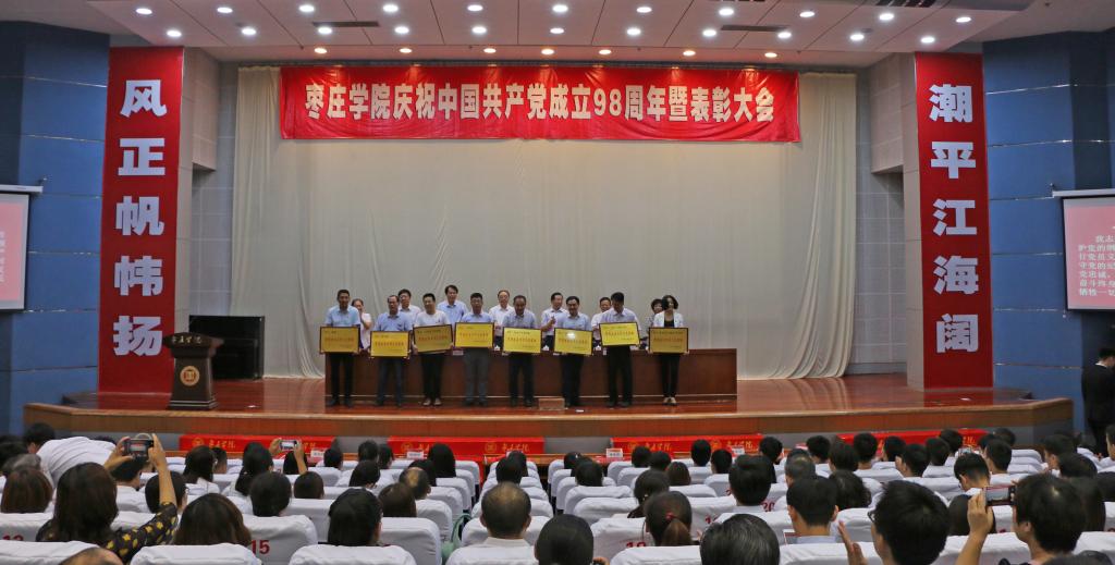 校党委副书记曾宪明宣读了《中共枣庄学院委员会关于表彰先进基层党组织和优秀党务工作者、优秀共产党员的决定》《关于表彰2019年枣庄学院思想政治工作先进集体、先进个人的决定》。数学与统计学院党总支等先进党组织、黄成亮等优秀党务工作者代表、杨全顺等优秀党员代表,人事处等思想政治工作先进集体、袁心等思想政治工作先进个人代表上台领奖。