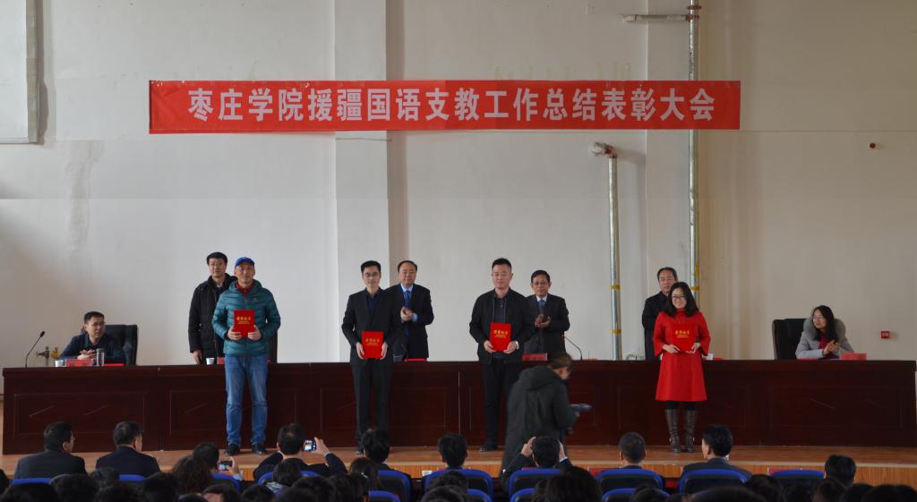 1月7日,枣庄学院援疆国语支教工作总结表彰大会在疏勒县东营第二希望小学会议室隆重举行。校党委书记曹胜强,党委委员、副校长明清河,山东省援疆工作指挥部党委副书记、喀什地委组织部副部长邓泽宇,喀什地区教育局师资培训管理中心副主任巴哈尔·古力,东营市援疆工作指挥部党委书记、指挥、疏勒县委副书记曹永湖,东营市援疆工作指挥部副指挥、疏勒县委常委、副县长杨凯,疏勒县教育局双语教学办公室主任王润,枣庄学院相关部门负责人和部分二级学院党总支书记、院长,各受援学校领导和援疆支教团全体师生参加会议,大会由明清河主持。