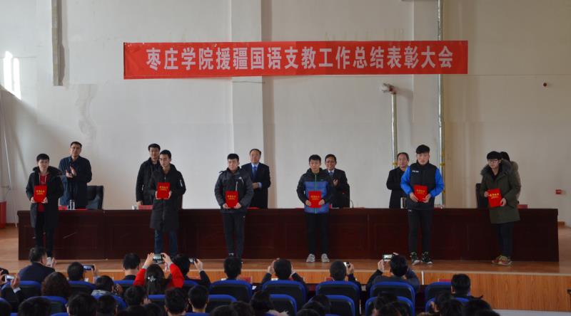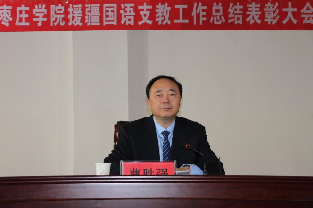 曹胜强作总结讲话。他指出,4名带队教师和202名支教学生,以心系国家、服务人民的理想,以奋发有为的精神面貌和扎实有力的工作态度,取得了斐然的成绩,有利地助推了当地国语教学改革,受到了普遍赞誉和一致好评。202名支教学生分布在疏勒县16所学校,其中县城内8所,巴仁乡学校8所,涵盖幼儿园、小学、初中、高中各年级各学科,共教授264个班级,所教学生数多达12600余人,周课时共计2875课时,30名学生兼任班主任,指导学生社团8个。同学们在上课之外,积极参与班级管理,组建校内合唱团、篮球队等兴趣社团,参与校内图书档案整理、墙绘宣传制作等工作。支教团成员以实际行动实现了“三个践行”和“三个增强”:践行了社会主义核心价值观,践行了“兼爱 尚贤 博物 戴行”的校训,践行了人民教师的园丁精神,增强了政治素质,增强了思想觉悟,增强了职业本领,生动诠释了我校办学理念和人才培养质量,充分展现了枣庄学院学子的风采,提高了枣庄学院的美誉度,人民日报、山东电视台、疏勒电视台记者都对支教团工作进行了专访。4名带队教师不辞辛劳,敢于担当,及时解决学生在支教过程中遇到的各种困难和问题。在有效完成对支教学生管理工作的同时,不断创新工作方法,加强支教团的内涵建设,丰富支教业余生活,形成了一套切实可行的支教管理模式,让202名支教学生在短时间内,迅速成长为业务能力强,深受领导喜爱、学生欢迎的优秀人民教师。