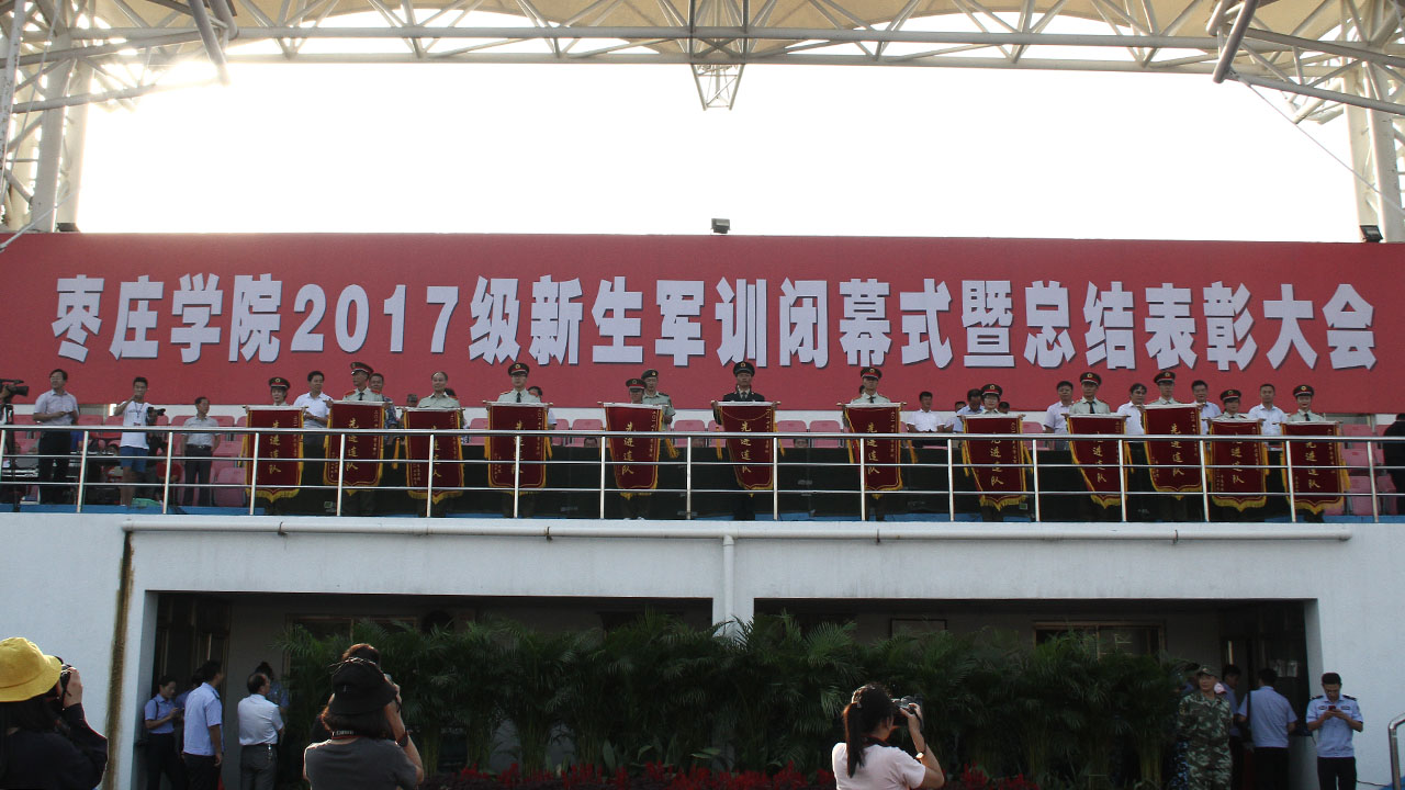 9月20日下午,我校2017级新生军训闭幕式暨总结表彰大会在学校西田径场举行,校党委副书记、校长李东,副校长李进京、明清河、李目海、纪委书记韩素玲、校领导刘书银,枣庄军分区政委韦昌进出席。大会由副校长明清河主持。