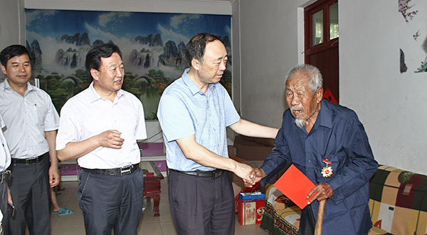 曹胜强、李东等一行首先走进涝岭村老党员王传忠家中。王传忠同志现年96岁,1941年3月入党,是一名参加过淮海战役的光荣退伍军人。曹胜强紧紧拉住他的手,询问生活、健康等情况,看到他身体依然很硬朗,非常高兴。曹胜强说,在党的生日即将到来之际,学校党委专门来看望老党员、生活困难党员,向大家送上一份真挚的祝福。96年来我们党所走过的光辉历程和取得的伟大成就,是一代又一代共产党员不懈奋斗的结果。您是新中国成立前入党的老党员,您为党和人民做出的贡献,我们不会忘记。衷心祝愿您生活幸福、身体硬朗、健康长寿。随后,曹胜强亲手为王传忠同志佩戴了慰问勋章。