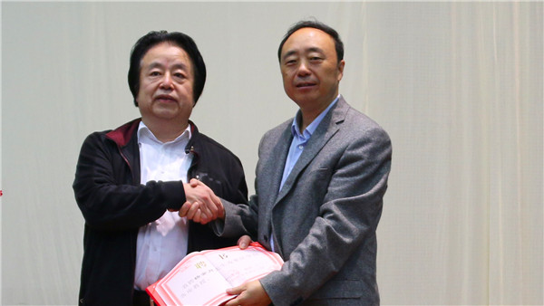 讲座伊始,我校正式聘请杨金月、郑均衡为客座教授,校长曹胜强颁发证书并合影留念。