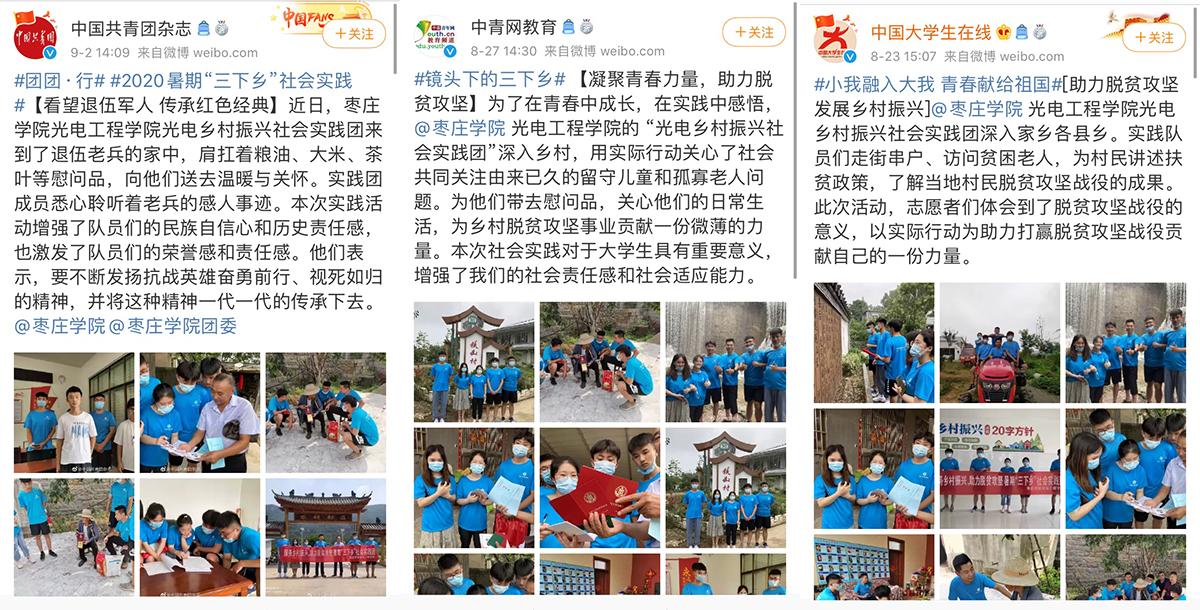 截至发稿前,光电工程学院2020年暑期“三下乡”社会实践活动被中国共青团杂志、中青网教育、中国大学生在线、多彩大学生网、山东校园、齐鲁公益等多家媒体报道及转载154篇次。报道总数再创新高。其中,光电学院“三下乡”《看望退伍军人 传承红色经典》被“中国共青团杂志”新媒体平台报道。