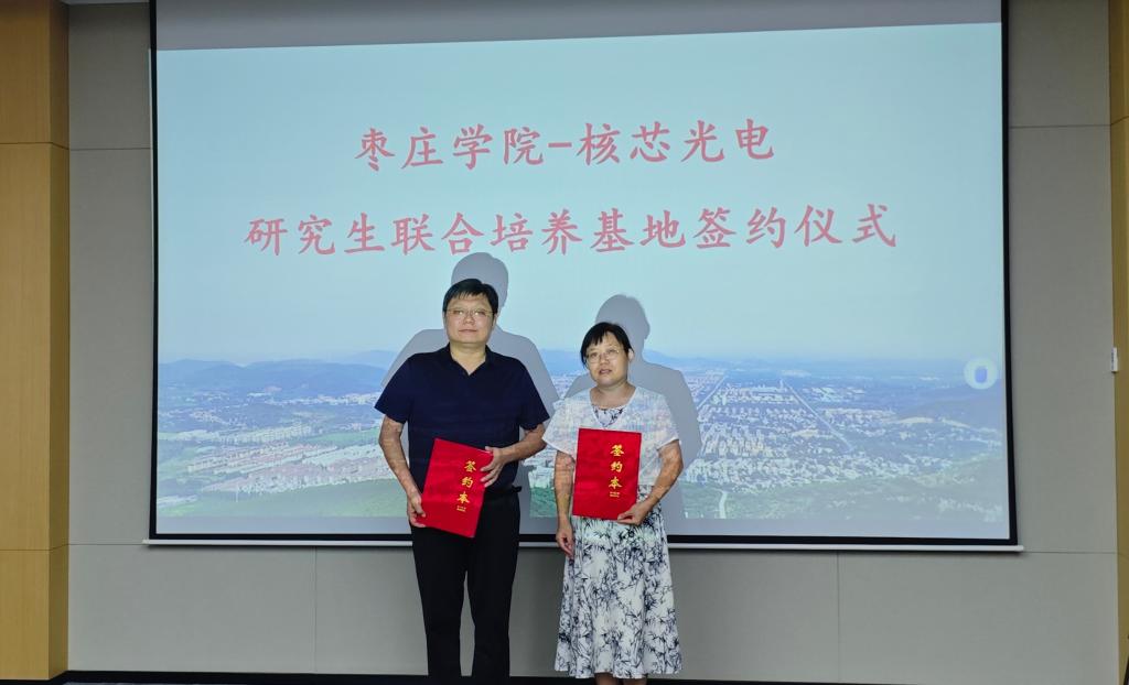 会上,枣庄学院-核芯光电研究生联合培养基地协议签约仪式举行,梁兰菊院长与曹学蕾总经理作为代表签订合作协议。
