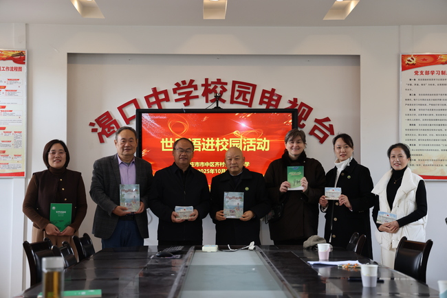 孙明孝向要长春校长介绍了世界语的历史,现状,以及枣庄学院国际世界语博物馆和世界语专业的建设情况。他指出,世界语“天下大同、人类一家”的理念与人类命运共同体理念高度契合。要长春校长对孙明孝一行表示欢迎,并希望“世界语进校园”活动能促进同学们学习课外知识,开阔国际化视野,了解和学习世界语。孙明孝一行向渴口中学赠送了我校编译的世界语图书《世界语与跨文化交际》《世界语基础》和《静静的船舶:汉译世界语文选》,以及文创产品AI版“枣院风光”明信片。