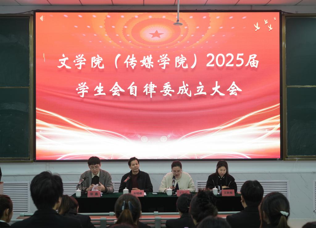 为加强学生骨干队伍建设,提升学生组织的服务效能,12月10日,文学院(传媒学院)于增信楼112教室举行2025届学生会、自律委换届大会暨“青马工程”培训班开班仪式。文学院党委书记宋明峰以及辅导员和全体学生干部出席本次大会。