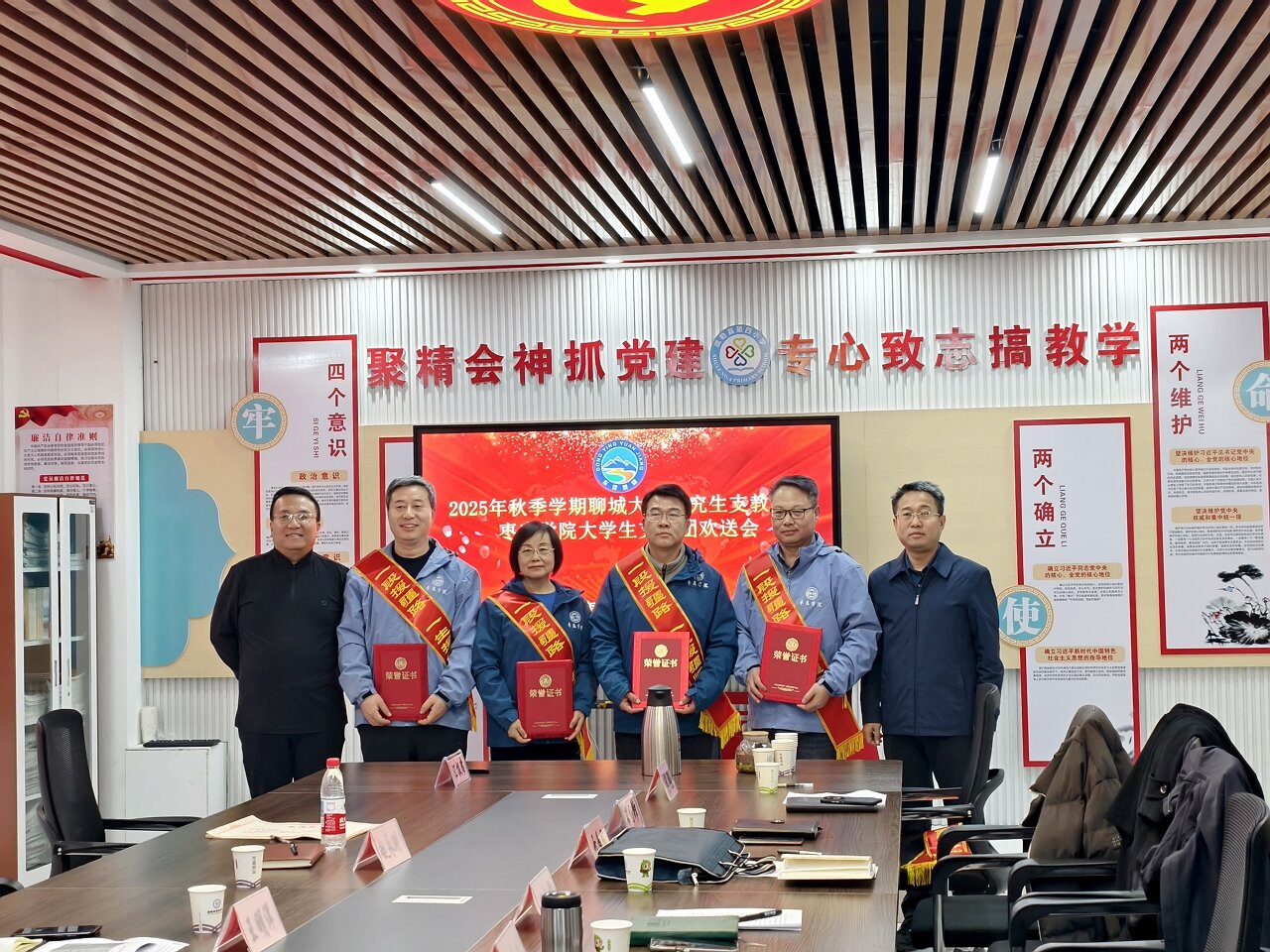 大会表彰了在疏勒县教育一线辛勤付出的12名山东援疆支教教师,并颁发了东营市援疆工作先进个人荣誉证书与援疆纪念奖杯。受表彰团队由枣庄学院第十三批援疆实习支教团的4名带队教师(何芳、陈原国、胡笑奇、马耀华)与聊城大学的8名研究生共同组成。指挥部表扬他们克服困难,将先进教育理念和满腔热忱倾注于疏勒学子,成为知识的传播者和民族团结的使者。