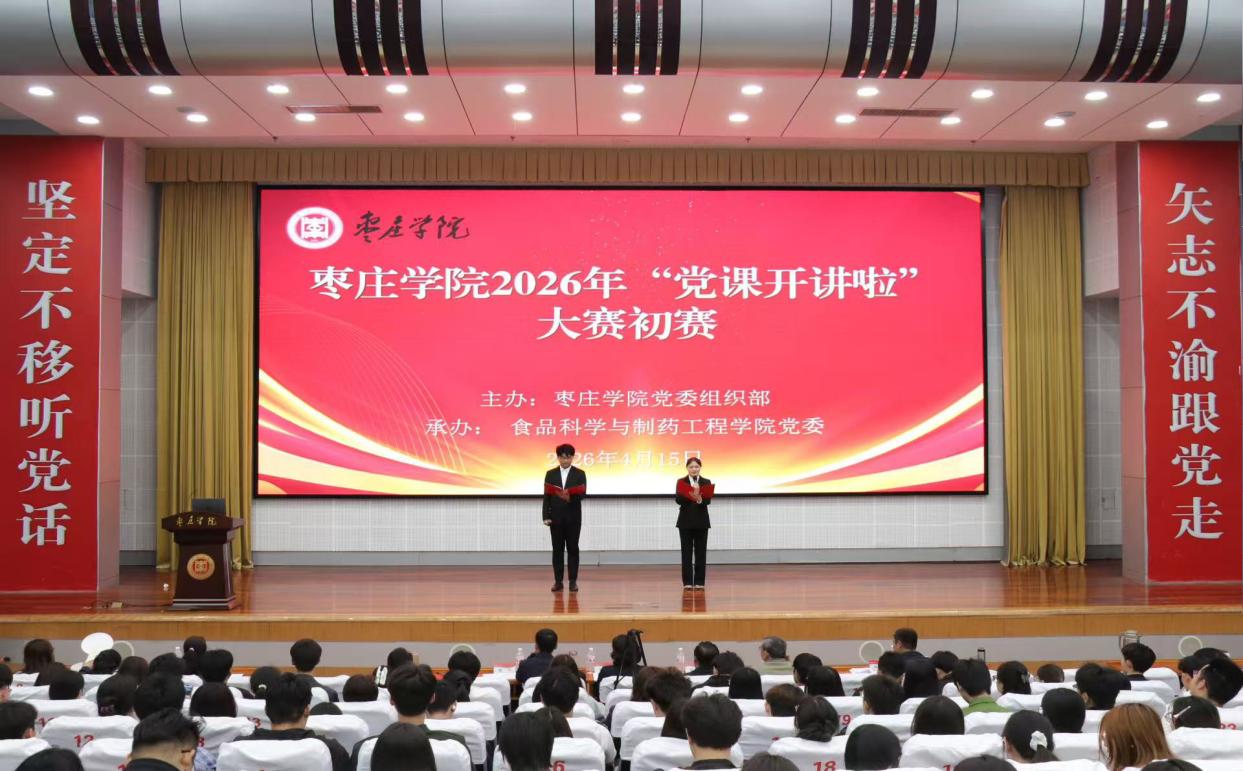 为深入贯彻新时代党的建设总要求,庆祝中国共产党成立105周年,扎实推进“党建好案例、书记好党课、党员好榜样”系列活动走深走实,4月15日下午,由学校党委组织部主办、食品科学与制药工程学院党委承办的枣庄学院2026年“党课开讲啦”初赛在市中校区综合楼报告厅顺利举行。