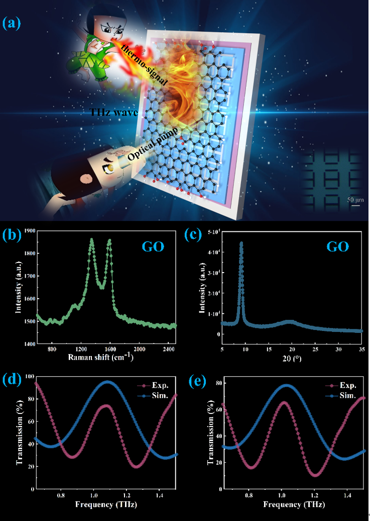 氧化石墨烯凭借表面含氧官能团的独特性质,其载流子浓度和电导率可随温度动态调节,当808nm连续激光、电加热信号激发时,光热效应引发的温度变化会改变氧化石墨烯的电磁特性,进而调控超器件的共振状态。