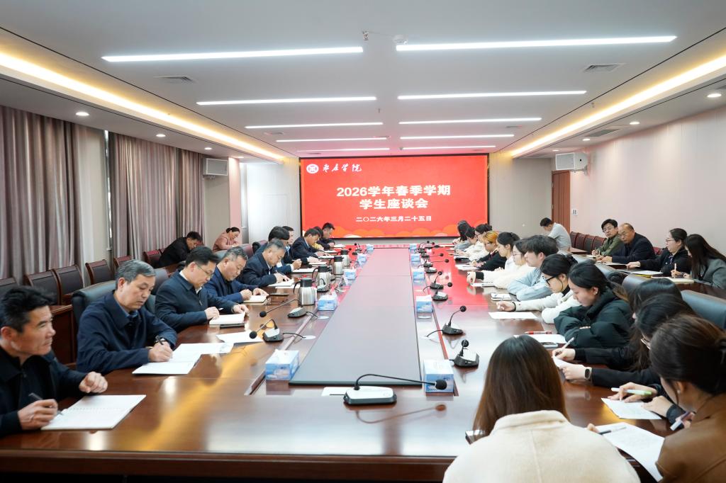 2026-03-263月25日下午,我校在明理楼519会议室召开学生代表座谈会,校党委书记高峰出席座谈会并讲话,校党委副书记、校长丛海林主持会议,校党委副书记丰雷,党委委员、宣传部部长闫昕出席会议。座谈会上,来自各二级学院的学生代表立足自身学习生活实际,围绕教育教学改革、后勤服务保障、校园环境管理、学风建设提升、就业指导服务、文体活动开展等方面畅所欲言,提出一些中肯、务实的意见和建议。相关职能部门负责人认真倾听,并对学...
